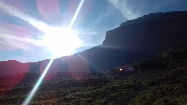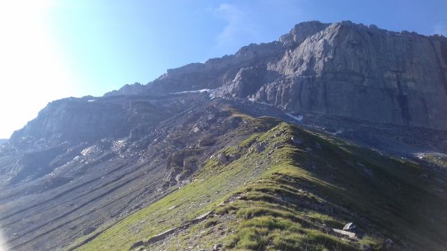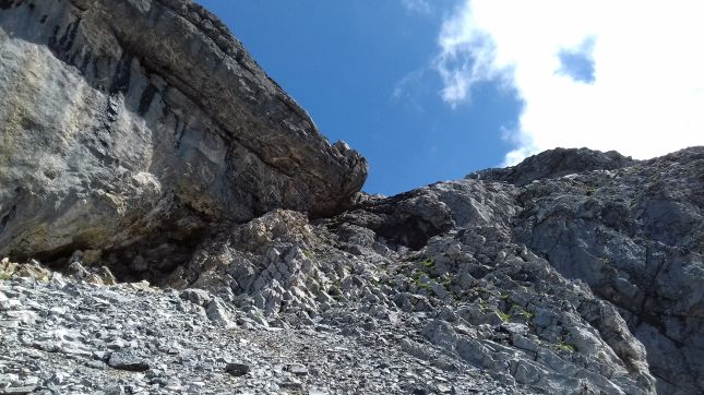 J'atteins un premier replat. L'arête semble devenir plus raide au-dessus. Je décide de sortir casque et piolet. La progression est toujours facile pour le moment, avec de bonnes marches et des traces de bestioles. L'herbe cède la place au rocher. Le terrain est encore composé de gros blocs et de graviers bien épais, mais ça ne va pas durer. Finalement, je rejoins le point où l'arête vient mourir contre la paroi.