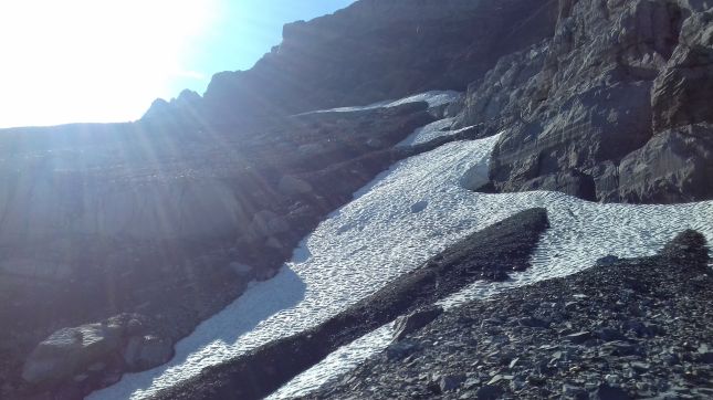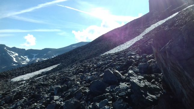 La suite se passe à gauche et c'est ici que les choses sérieuses commencent. Je dois franchir une ravine encombrée d'un gros névé en son centre. Le terrain devient schisteux et glissant. Les schistes sont humides en raison de l'orage de la veille. Les conditions ne sont pas idéales mais ça pourrait être pire. Le plus désagréable sur ce genre de terrain est de voir les schistes crouler sous les pieds. Les chevilles vont en prendre un coup.