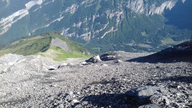 Pour l'heure, je me retourne pour poursuivre vers le Sud en direction de l'arête herbeuse qui monte dans la face Nord du Grenier de Commune. Les premiers mètres sont rendus difficiles par des vernes bien épaisses. Le sac accroche un peu partout. Le reste de l'arête est plutôt plaisant. A gauche, j'ai tout le loisir de contempler l'immense pente d'éboulis suspendu au-dessus du Fer-à-Cheval. Dire que tout ça va descendre un jour...brrrrrrrrr