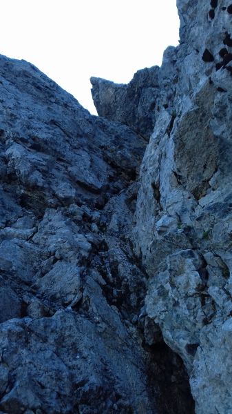 Je remonte tant bien que mal vers celle-ci. Le cheminement est tortueux et rien ne tient debout. La traversée des gradins est particulièrement éprouvante pour les nerfs. Tout me reste dans les mains, et je suis obligé de dégager prudemment les morceaux de schistes qui s'émiettent sous mes pieds. Une chute de pierre se produit à quelques mètres et me fait sursauter. Après de longues minutes, j'atteins finalement le pied de la cheminée où je range le piolet. L'escalade n'est pas des plus facile. Ce n'est pas tant la difficulté technique (du III tout au plus) qui me gène, mais plutôt la qualité très médiocre du rocher. J'ai l'impression de jouer une partie de démineur. A mi-hauteur, la cheminée se termine et se divise en deux rampes rocheuses. Celle de droite est plus raide et les prises sont moins franches. Je choisi donc celle de gauche, en avisant une petite brèche plus haut, qui devrait me permettre de rebasculer dans la rampe de droite à proximité de la sortie.