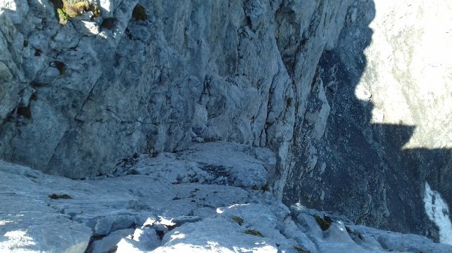 La remontée de la rampe se passe bien. Le rocher est solide et bien adhérent. Mais encore une fois, c'est la douche froide lorsque j'arrive sous la brèche. Il s'agit plutôt d'une petite banquette qui court à droite, au-dessus de la rampe. Elle permet effectivement de basculer vers la rampe de droite, mais le rocher est surplombant au-dessus. De fait, mon sac me dérange et le rocher est à nouveau foireux. Je reviens en arrière dans la rampe...avant de revenir vers la banquette. Je me dis qu'il n'y a quand même pas long à traverser, 2 à 3 mètres tout au plus. Assis sur la banquette, je traverse cm par cm avec les pieds face au vide. La rampe est à peine un mètre sous moi, mais chuter ici n'est clairement pas une option.