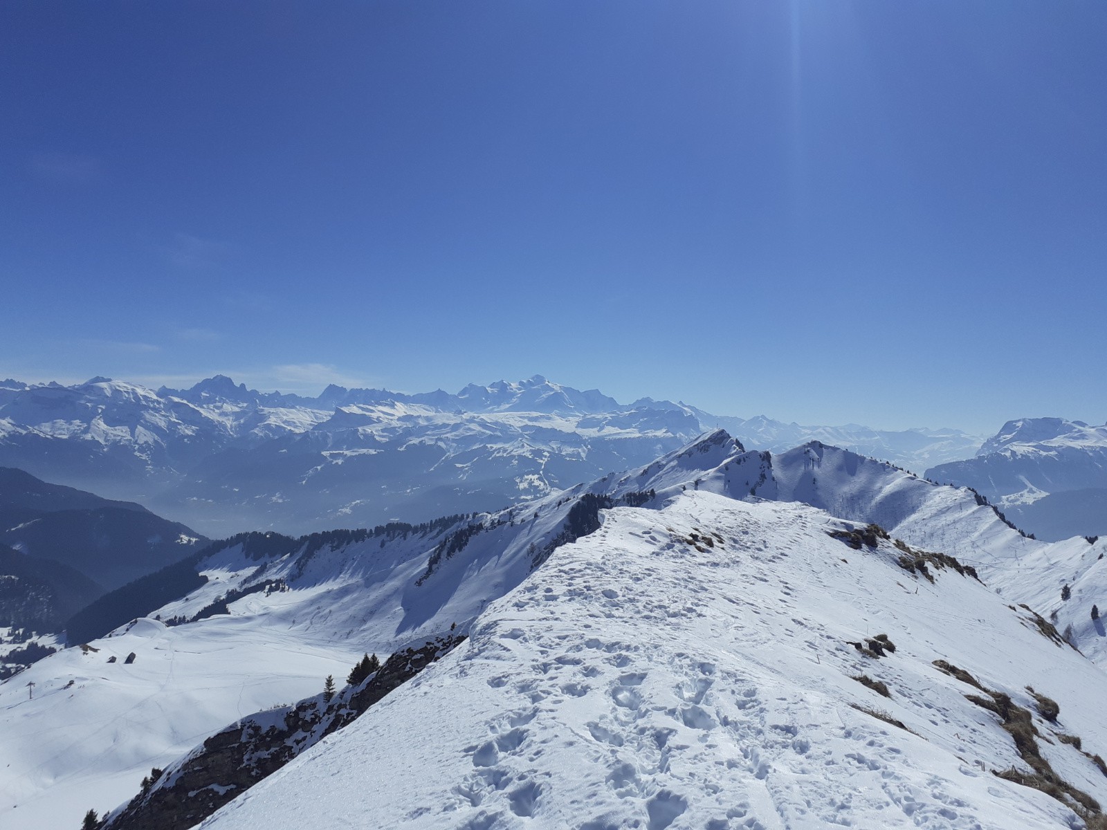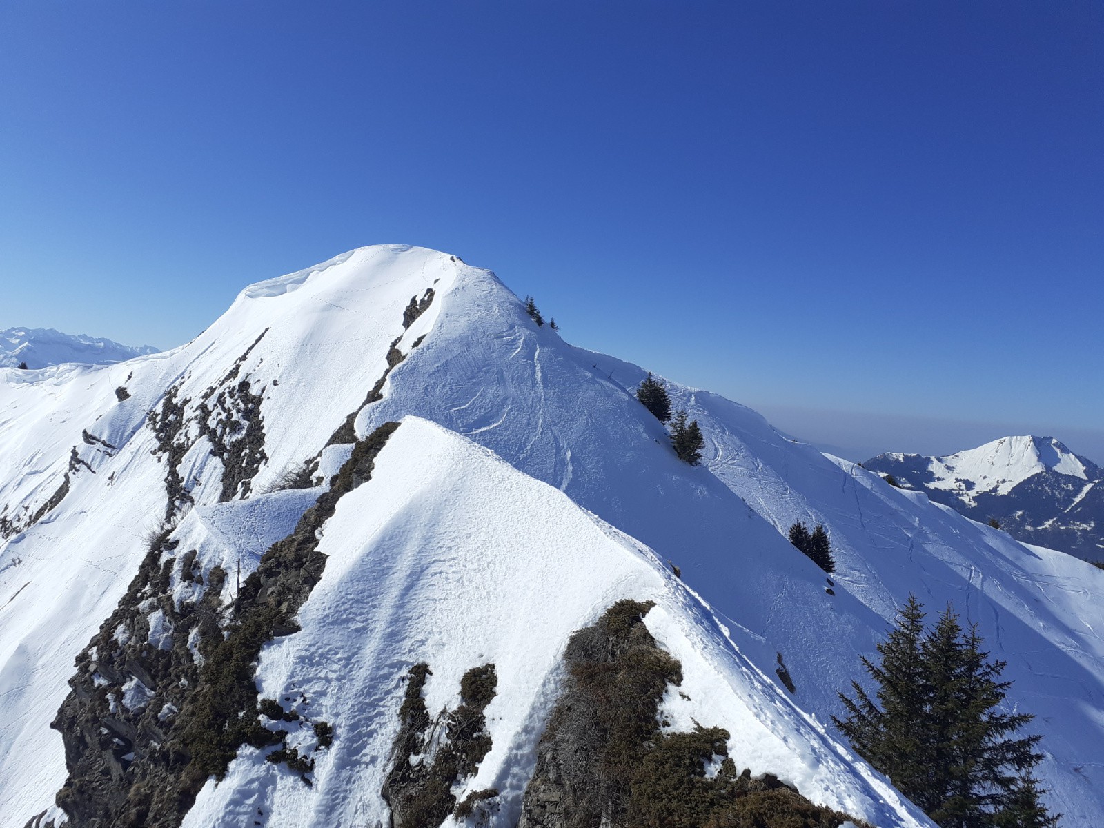 N'ayant jamais réalisé la Couennasse en hiver, je décide de couper au plus court, en suivant une trace qui remonte au plus vite vers l'arête. La montée est très efficace, et en quelques Z, je débouche sur l'arête Est, à mi-chemin entre le col passé précédemment et le sommet principal. Je mets les skis sur le sac et remonte l'arête à pieds jusqu'à l'antécime Est (1921 mètres). En poursuivant vers la dépression qui me sépare du sommet principal, j'ai la surprise de me retrouver face à un ressaut rocheux aérien d'environ 5 mètres. Rien d'insurmontable en été, mais là, avec les chaussures de ski, je n'ai pas vraiment confiance et décide de ne pas me lancer dans une désescalade aujourd'hui. Il est déjà 11h, alors tant pis pour le vrai sommet. Direction le Haut Fleury !