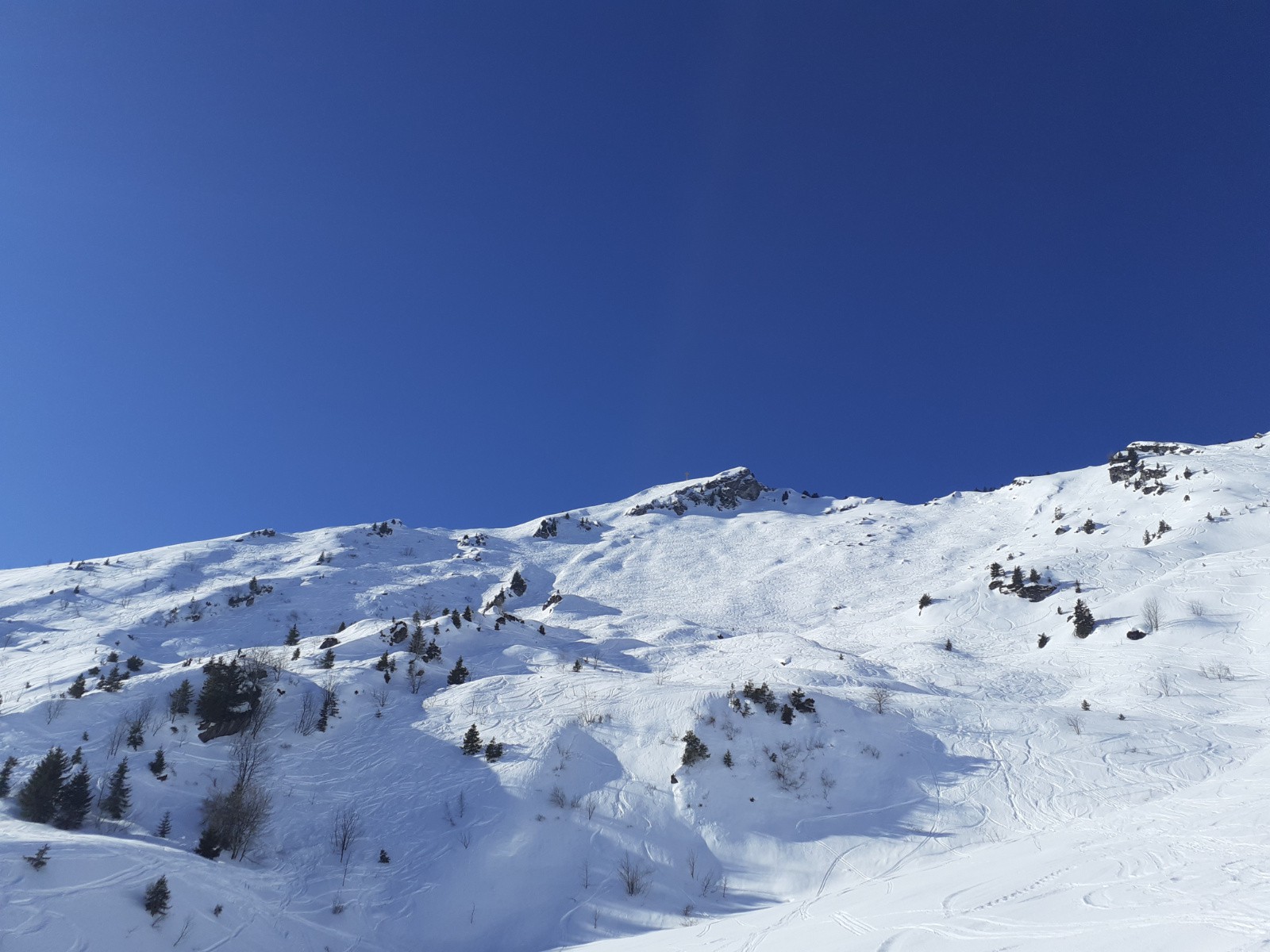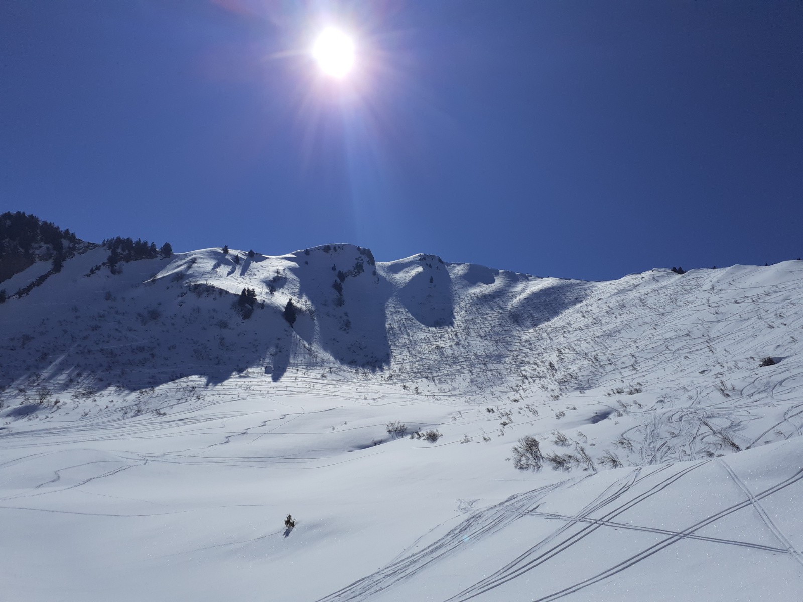 Je démarre à 9h sous un soleil déjà bien chaud. Les conditions anticycloniques perdurent depuis presque deux semaines, et j'ai un peu peur de la qualité de la neige aujourd'hui. Ma dernière visite au Marcelly, réalisée il y a 8 jours de cela en pleine poudre, semble déjà loin. La montée démarre tranquillement sur l'itinéraire aménagé de la station qui monte en direction du petit plateau situé sous le Marcelly. La station s'anime tout doucement, et seul un autre randonneur me suit de loin. Une fois sur le plateau, je rejoins rapidement le pied de la face Nord-Est du Marcelly, déjà bien ensoleillée sur sa partie basse.