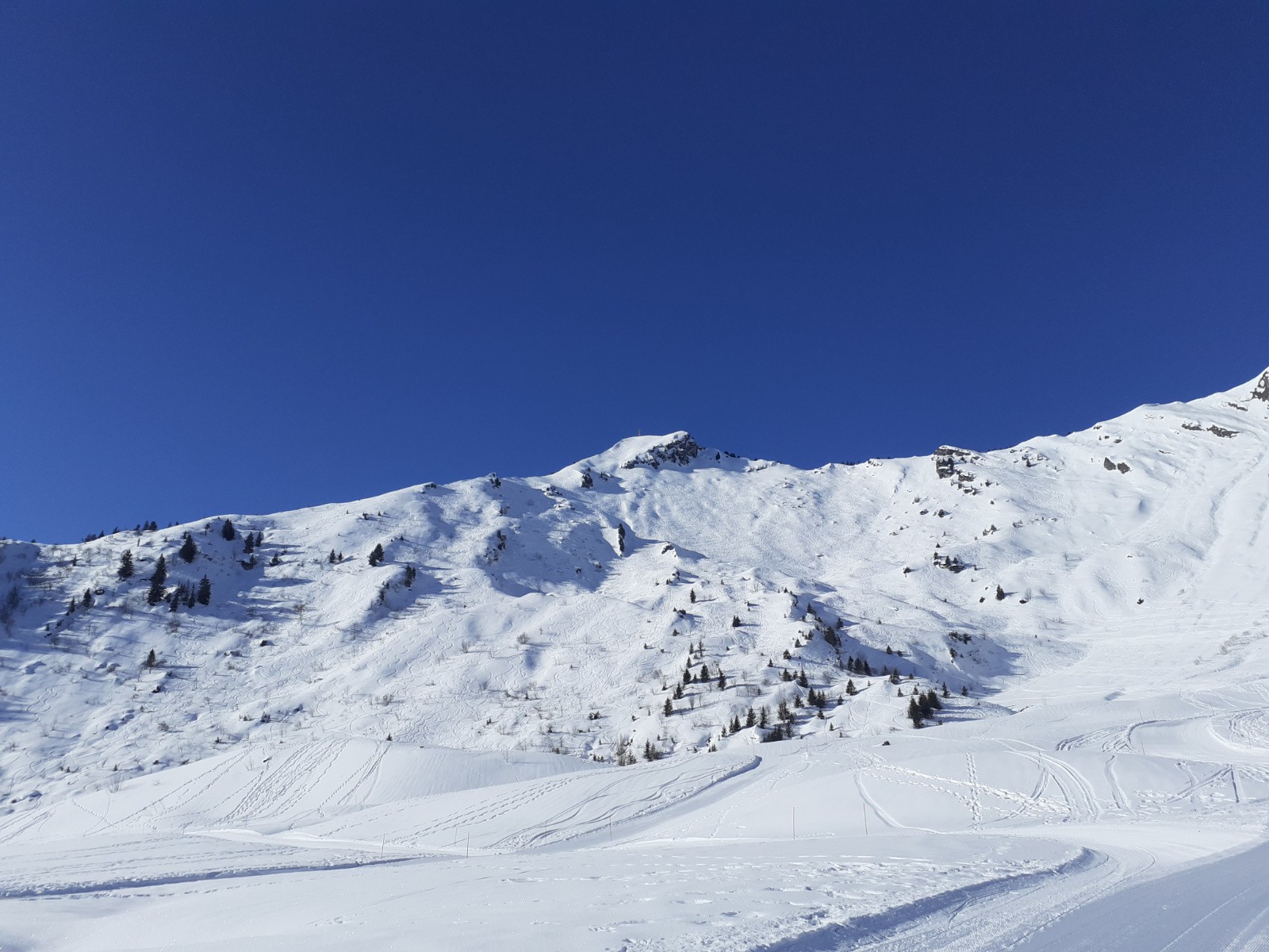 Après un rapide coup d’œil panoramique, j'entame la descente. La neige est encore relativement bonne, avec une poudre tassée bien agréable à skier et ce en dépit des multiples passages qui ont transformé le Marcelly en vulgaire hors-piste. Je repeaute au niveau du plateau à 10h15 et reprends l'itinéraire de randonnée de la station qui monte vers le Lac de Roy. Au niveau du petit col qui permet de descendre sur le Chalet de Roy, j'hésite un instant à monter directement à la Couennasse par l'arête Est. Finalement, je décide de rester sur l'itinéraire classique du versant Nord, et entame la traversée vers l'Ouest pour rejoindre celui-ci.
